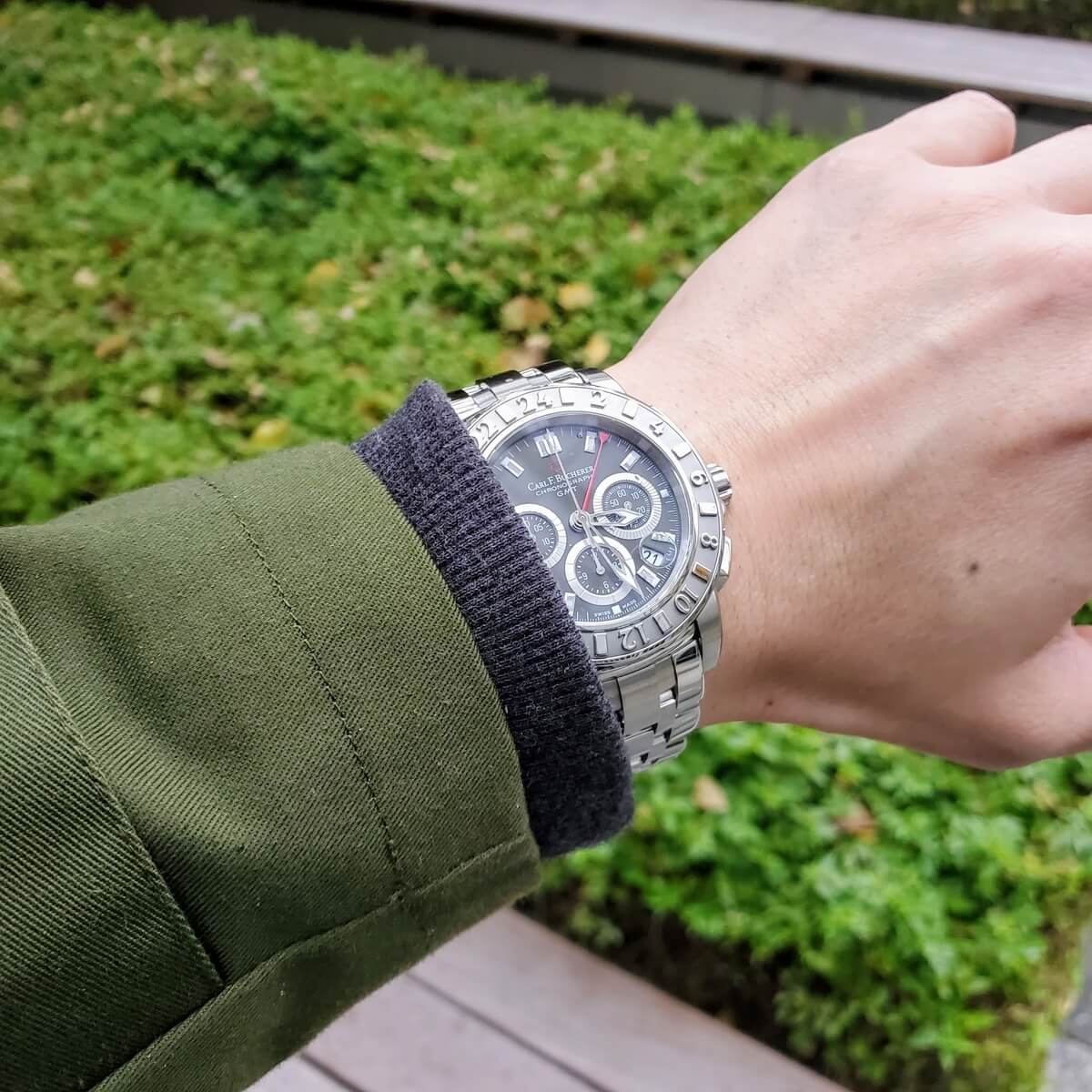 カール F. ブヘラ「パトラビ クロノグラフ GMT(10618.08)」。ド派手なので袖口からひょっこり見えるくらいで丁度いい。冬の装いが似合う時計です。