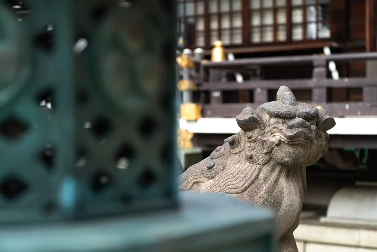 お次は「狛犬」さんです。まずは灯籠からひょっこり。奥の拝殿のボケと手前の灯籠のボケに挟まれて、狛犬さんの存在感が引き立ちます。モノクロで仕上げたら、実相寺昭雄監督の画っぽくなるかもしれません(笑)