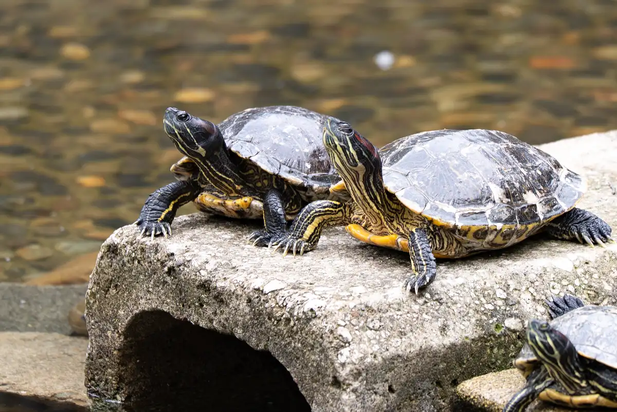 眠たそうな亀さん2匹を拡大したのがこの写真です。低画素ですから精細さは確かに感じないですし、実際、データとしてはかなり甘い画(そもそもWebp圧縮してますしねぇ)