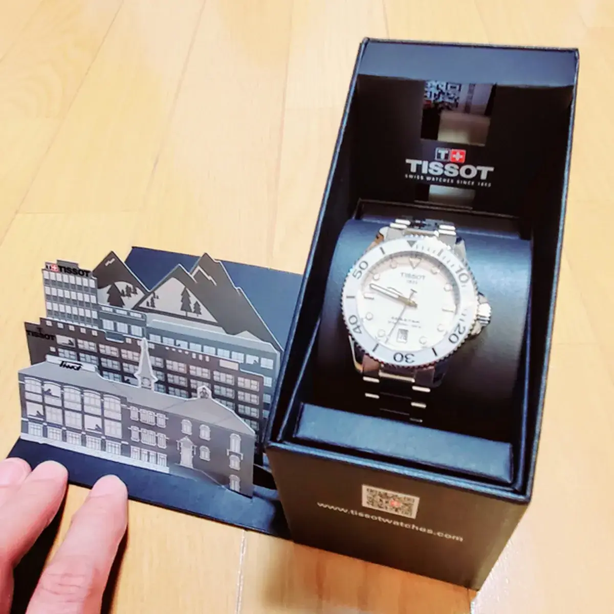 箱を展開すると、腕時計本体とともに「飛び出す絵本」のような街並みが現れました。これは何処でしょうか??ティソさんの本社が存在する、スイスの「ル・ロックル」なのかもしれません。「こんな街からお届けしてます♬」…ティソさんからそんなメッセージが届いたようで、何ともユニークでほっこりした瞬間でした。